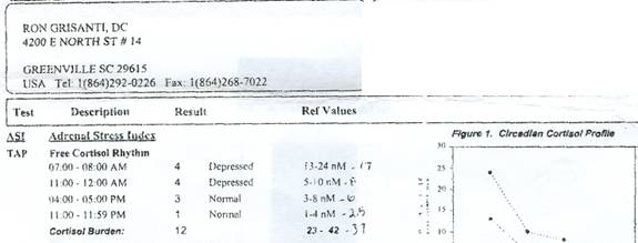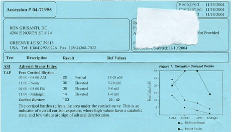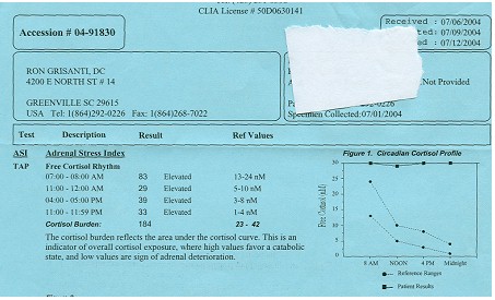 Take a look at the following adrenal test Dr. Grisanti ordered on Pat in July 2004. As you can see, her cortisol levels were out of control.